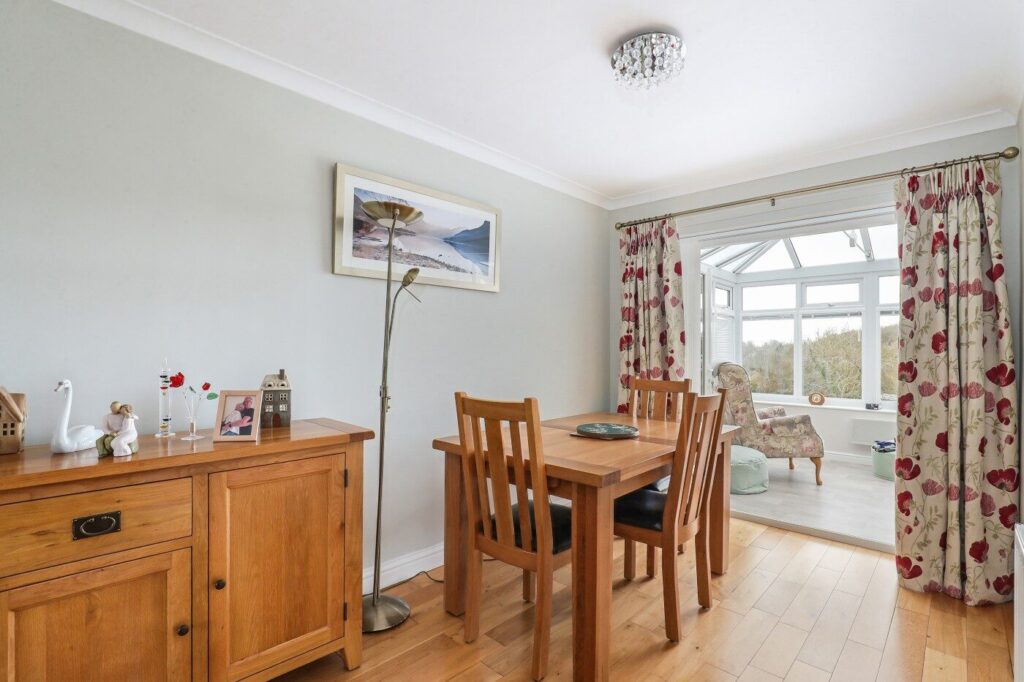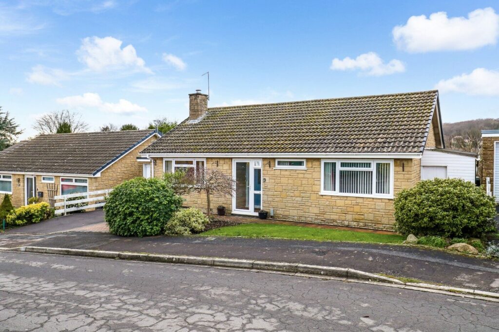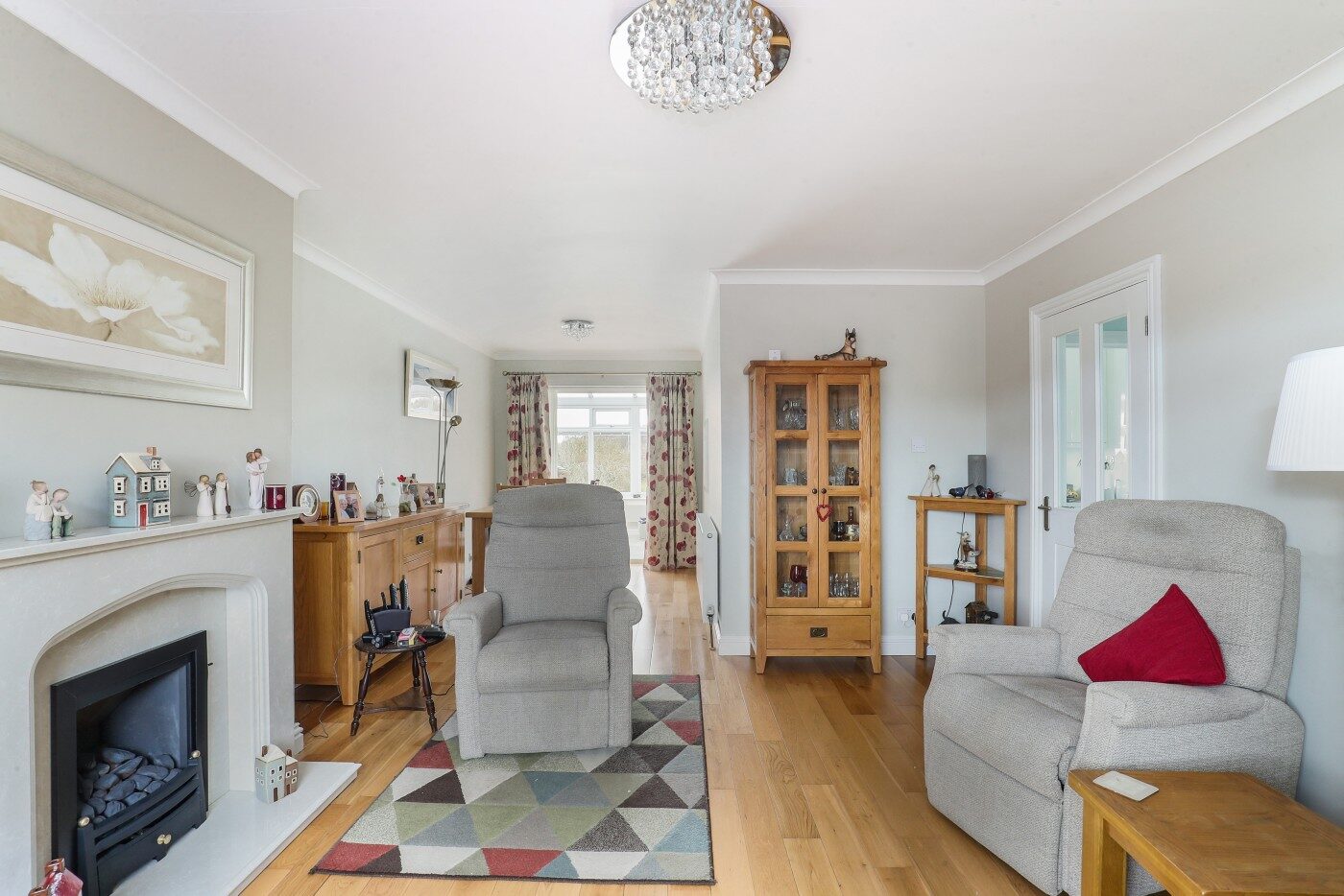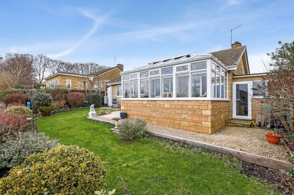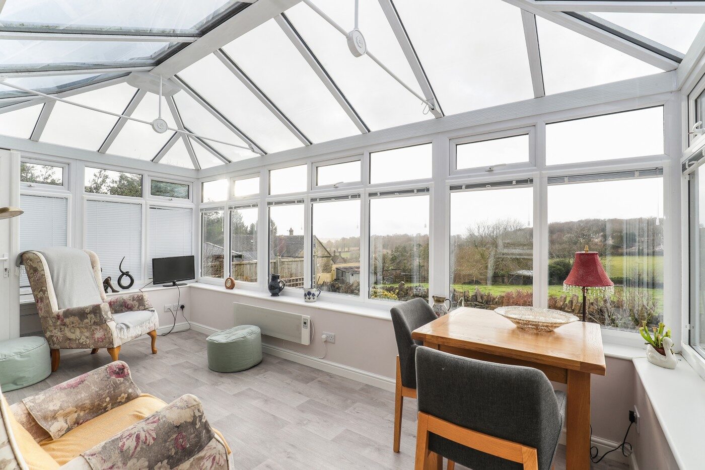 Backing onto an open neighbouring field and enjoying elevated views across the valley, this detached bungalow has been upgraded in recent years to provide bright, beautifully presented accommodation set within attractive landscaped gardens. A useful entrance porch leads into an inner hallway giving access to the living space and bedrooms, with oak flooring running throughout the property except for the tiled kitchen and shower room. The wellproportioned reception room offers space for both living and dining, centred around a fireplace with living flame gas fire, and benefits from a double-aspect outlook with French doors opening into a recently constructed conservatory. The conservatory has been a transformative addition to the bungalow providing year-round enjoyment of the garden and views. The kitchen, which also opens onto the garden, is fitted with contemporary highgloss units, quartz worktops, integral Neff double oven and microwave, electric hob and dishwasher, along with a useful pantry. There are two double bedrooms, one particularly generous in size, both with built-in storage, served by a fully tiled and stylishly fitted shower room with fitted Mira shower and heated towell rail. Other features include recently refitted windows and an electric garage door. The property is subject to covenants detailed in a 1970’s conveyance, when the property was built, details available.