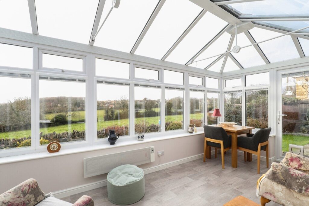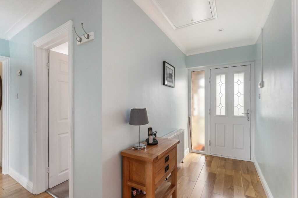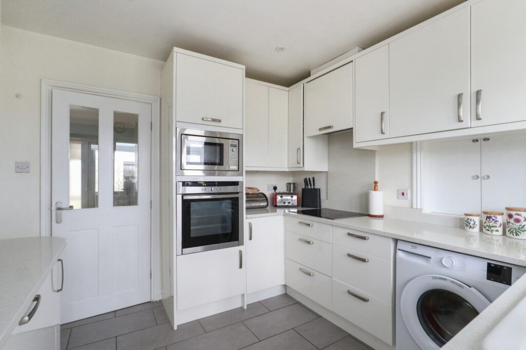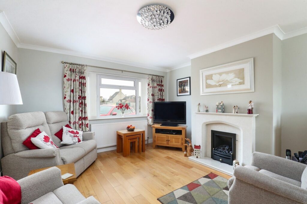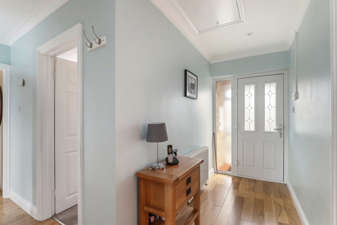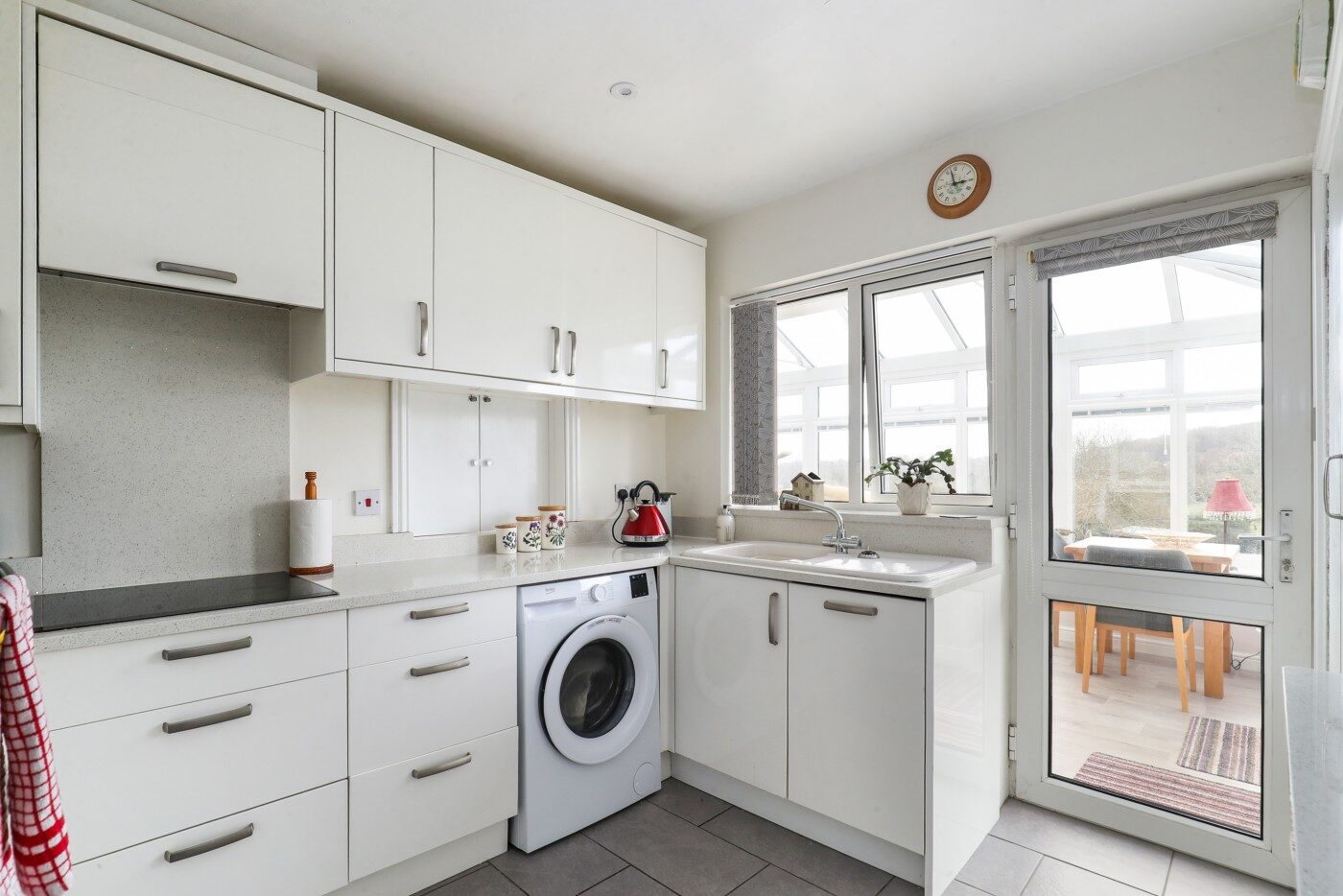 Backing onto an open neighbouring field and enjoying elevated views across the valley, this detached bungalow has been upgraded in recent years to provide bright, beautifully presented accommodation set within attractive landscaped gardens. A useful entrance porch leads into an inner hallway giving access to the living space and bedrooms, with oak flooring running throughout the property except for the tiled kitchen and shower room. The wellproportioned reception room offers space for both living and dining, centred around a fireplace with living flame gas fire, and benefits from a double-aspect outlook with French doors opening into a recently constructed conservatory. The conservatory has been a transformative addition to the bungalow providing year-round enjoyment of the garden and views. The kitchen, which also opens onto the garden, is fitted with contemporary highgloss units, quartz worktops, integral Neff double oven and microwave, electric hob and dishwasher, along with a useful pantry. There are two double bedrooms, one particularly generous in size, both with built-in storage, served by a fully tiled and stylishly fitted shower room with fitted Mira shower and heated towell rail. Other features include recently refitted windows and an electric garage door. The property is subject to covenants detailed in a 1970’s conveyance, when the property was built, details available.