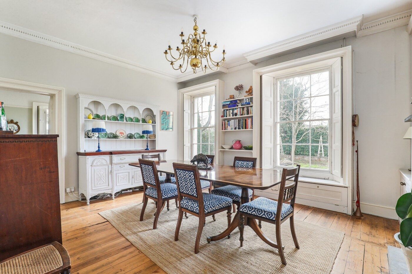 Berryfields House forms the south side to a prominent and attractive Grade II Listed Georgian home, conveniently positioned on the edge of Stonehouse, offering excellent access to schooling, shops and the wider road network. Tucked away within level, generous grounds extending to over half an acre, the property exudes period grandeur with striking architectural features both internally and externally. From the initial approach, classic Georgian details are evident, including Regency ironwork, elegant sash windows and a distinctive oval window. The house provides beautifully bright and well-proportioned family accommodation arranged over two floors, extending to approximately 2500 sq ft (including the cellar). A columned main entrance opens into a reception hall, from which the principal living spaces flow. The current owners have reconfigured the interior to create a stunning openplan kitchen/dining room featuring bespoke, timeless cabinetry, a Belfast sink with brass tap, quartz worktop and an integrated dishwasher, with space for a range cooker and fridge/freezer, while an adjoining boot room provides useful storage and access to a downstairs cloakroom. The kitchen is complemented by a formal dining room with full-length sash windows and shutters, exposed wooden floors and a beautiful fireplace. Two interconnecting reception rooms are equally impressive, each enjoying glazed doors to the garden and canopied seating terrace, exposed floorboards, mouldings and picture rails. A step up from the hall leads to a useful playroom or study overlooking the front elevation, while stairs descend to a cellar. All bedrooms are located on the first floor, arranged around a large galleried landing with beautiful stained glass oval window. Bedrooms one and two enjoy a southerly aspect over the gardens and are particularly generous, with sash windows and exposed floorboards. The principal bedroom benefits from an en-suite and extensive built-in wardrobes. Two further bedrooms are served by a family bathroom with shower. A practical utility area is located off the first floor landing. The title register lists rights granted as ownership and boundaries have changed over time. These historic conveyances are available upon request.
