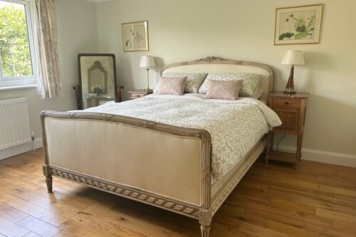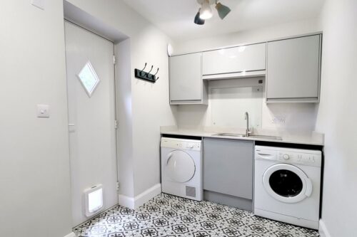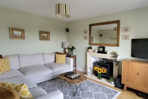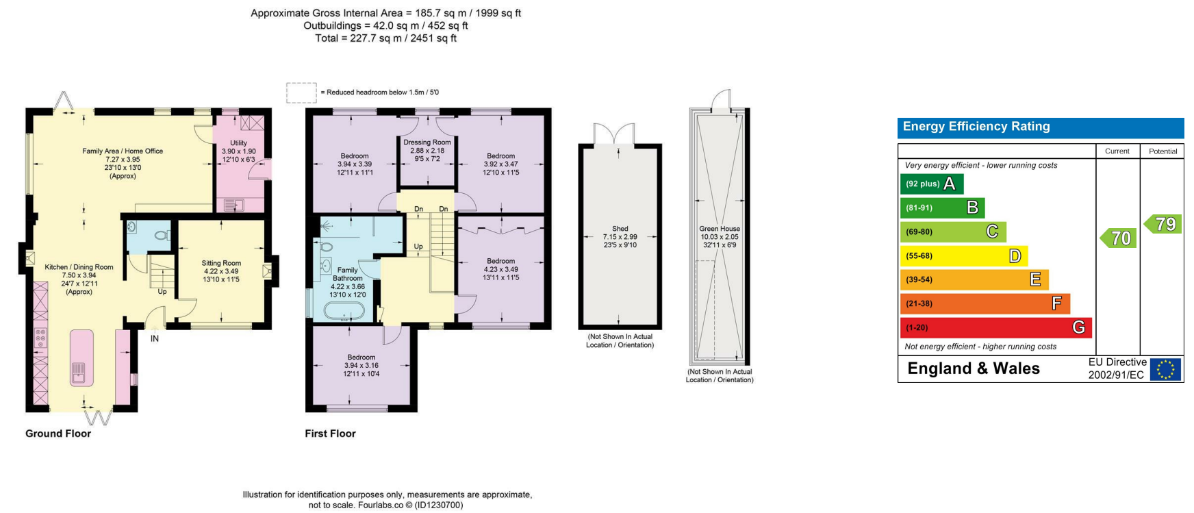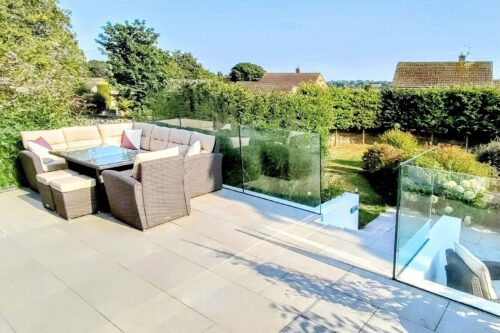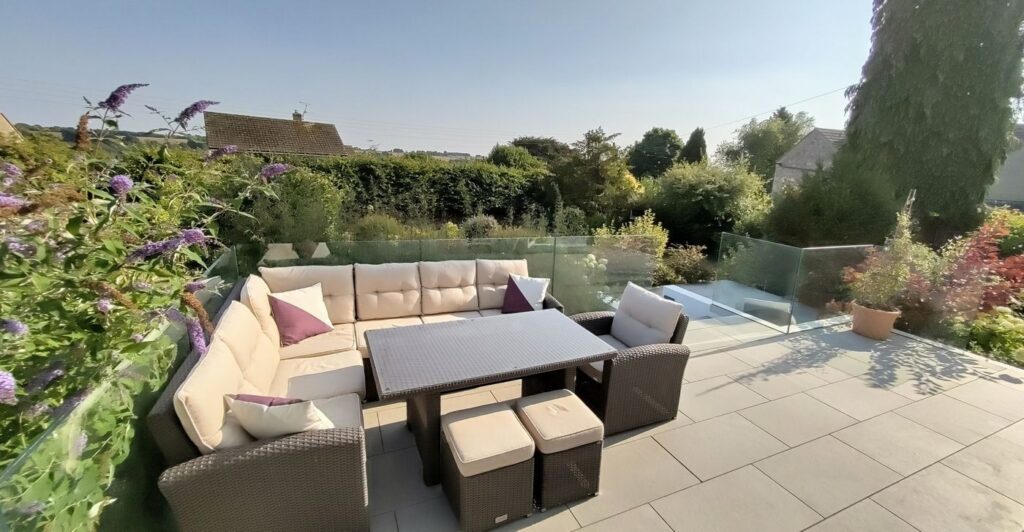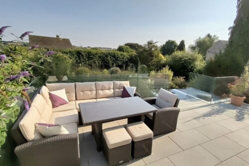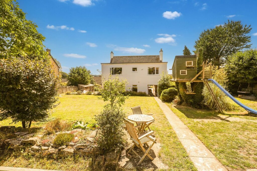Externally, the property sits within a generous third of an acre plot. The grounds are a real highlight, wrapping around the property and offering both privacy and outdoor space. At the front, a handsome Cotswold stone boundary wall and a row of pleached trees create a sense of seclusion. A large, gated driveway providing parking for multiple vehicles. The superb two-tiered patio to the front with a contemporary glass surround perfect for entertaining. The space is surrounded by a variety of mature planting, trees and lawn. This curves around the left side of the house to the rear garden, where much of the outdoor activities take place. Here you’ll find a 10m greenhouse with electricity and water, a 7.5m shed, raised vegetable beds, fruit trees, an additional lawned area, tree house and even a fun ‘hobbit’ mound for children to enjoy.