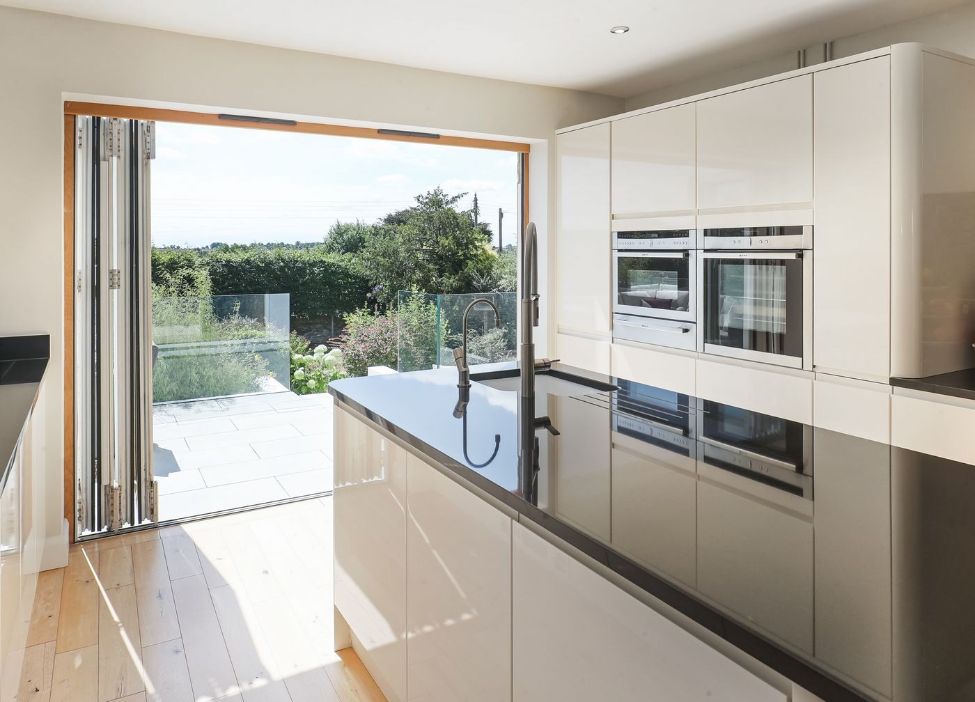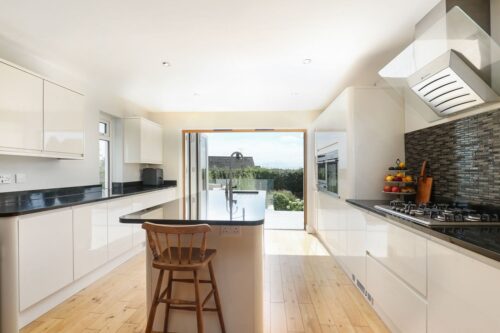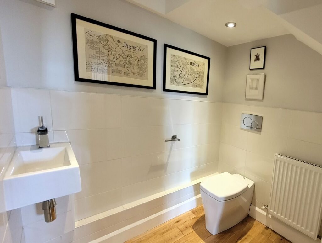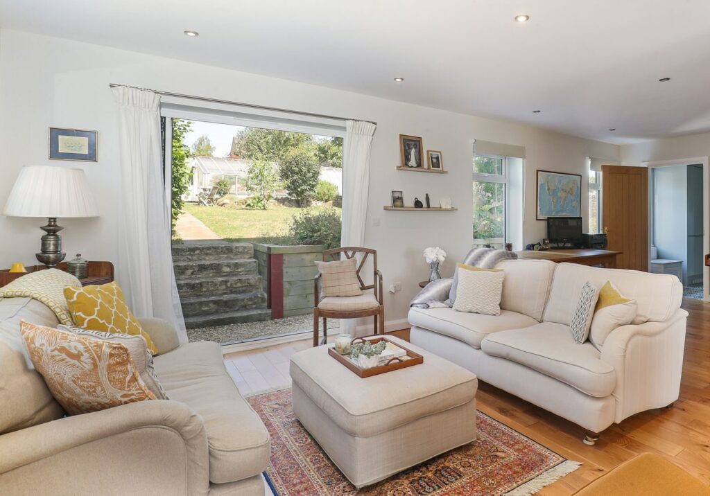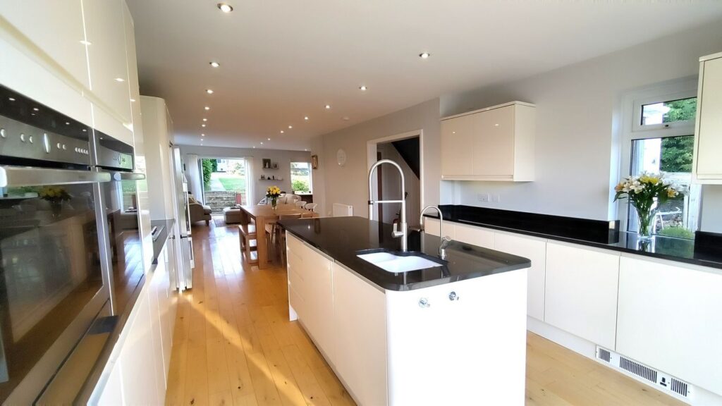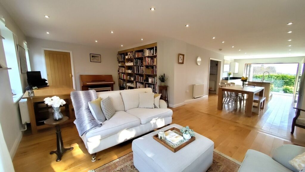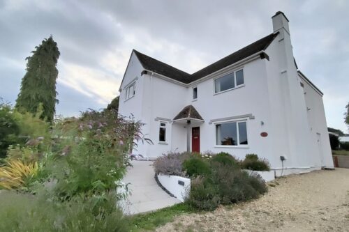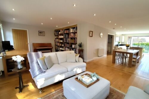 A beautifully presented and thoughtfully extended detached 1940s family home, set in the sought-after village of Chalford Hill. This property has undergone a comprehensive transformation and now offers superb contemporary living space. You enter via an open canopied porch into a bright hallway with cloakroom, built-in storage and staircase to the first floor. To the right, an inviting sitting room is centred around a stone fireplace with inset wood-burning stove. To the left lies the heart of the home: a ‘show stopping’ L-shaped open-plan kitchen, dining and family area — perfect for modern living. The front-facing kitchen is stylish and functional, featuring high-quality units, a central island, integrated Neff appliances (combination oven, main oven, warming drawer, gas hob), Quooker instant hot water tap and Bosch dishwasher. Folding sliding doors open onto a generous two-tiered terrace framed by the front garden — ideal for alfresco dining. This space flows into a dining area warmed by a second wood-burning stove, and beyond into a substantial rear living area extending along the house. Windows and bi-fold doors fill the room with light, connecting it to the garden. This versatile space suits entertaining, working from home, or a play area for children. A tiled utility/mudroom offers bespoke fitted storage, an integrated freezer and space for a washer and dryer. Side access is ideal for family life and muddy boots. Upstairs, a split-level landing leads to four double bedrooms. To the rear, two share a connected dressing room — ideal as a walk-in wardrobe or adaptable into an en suite (plumbing in place). The two front bedrooms enjoy far-reaching views, one with bespoke built-in wardrobes. The large family bathroom features a pedestal basin, WC, bath, large walk-in shower, and a walk-in storage area. A substantial, fully boarded loft with pull-down ladder provides storage while concealing the boiler, water filtration, home network and CCTV systems.