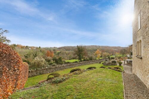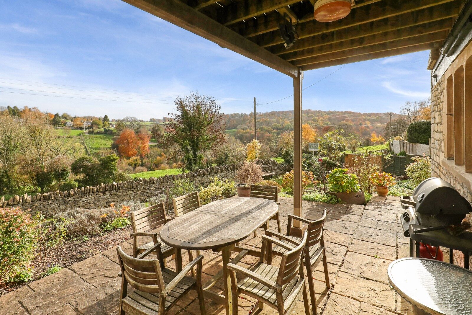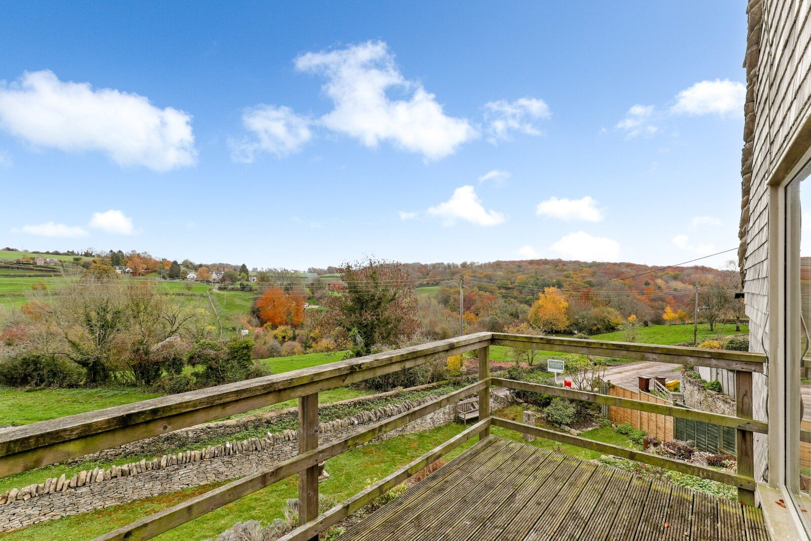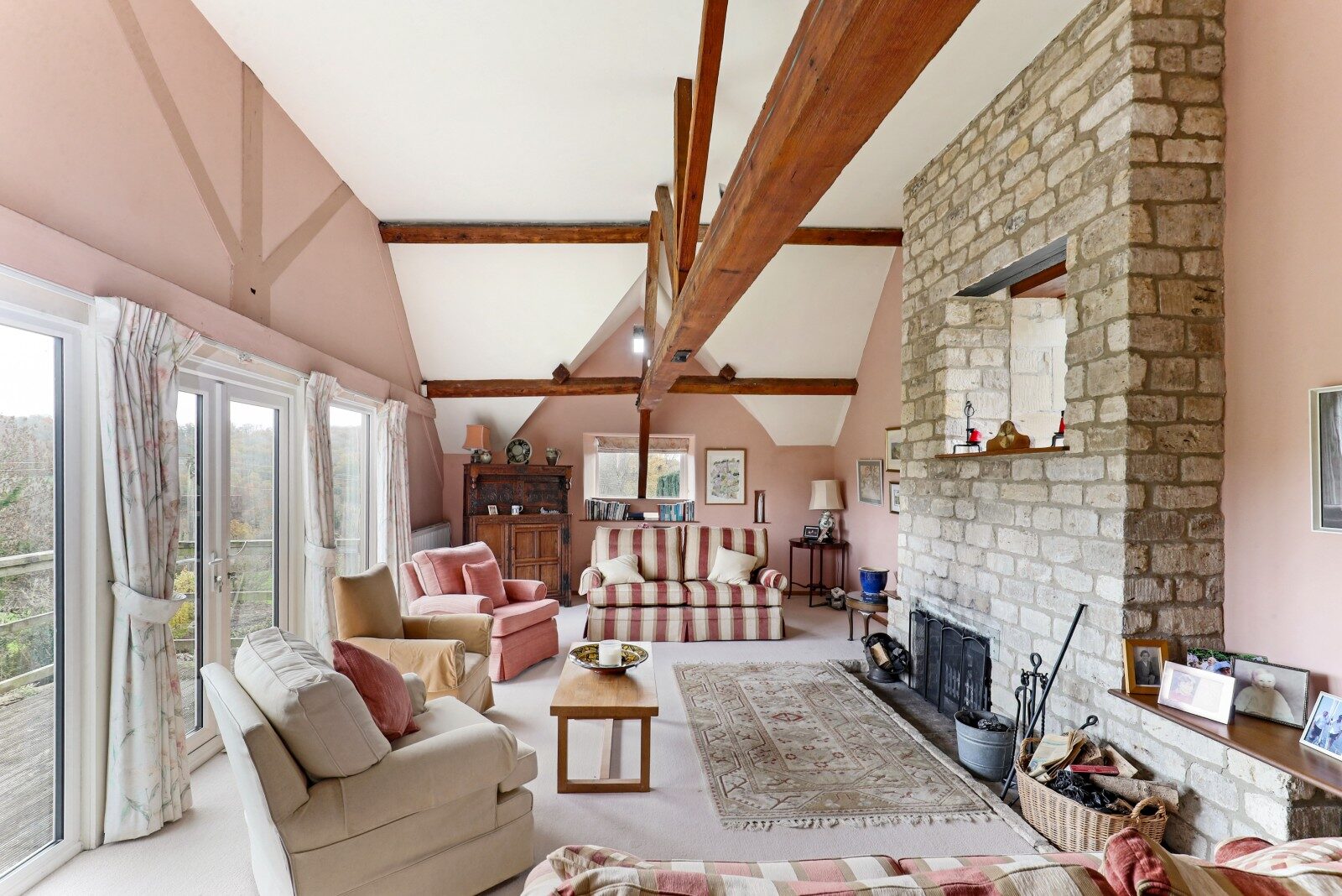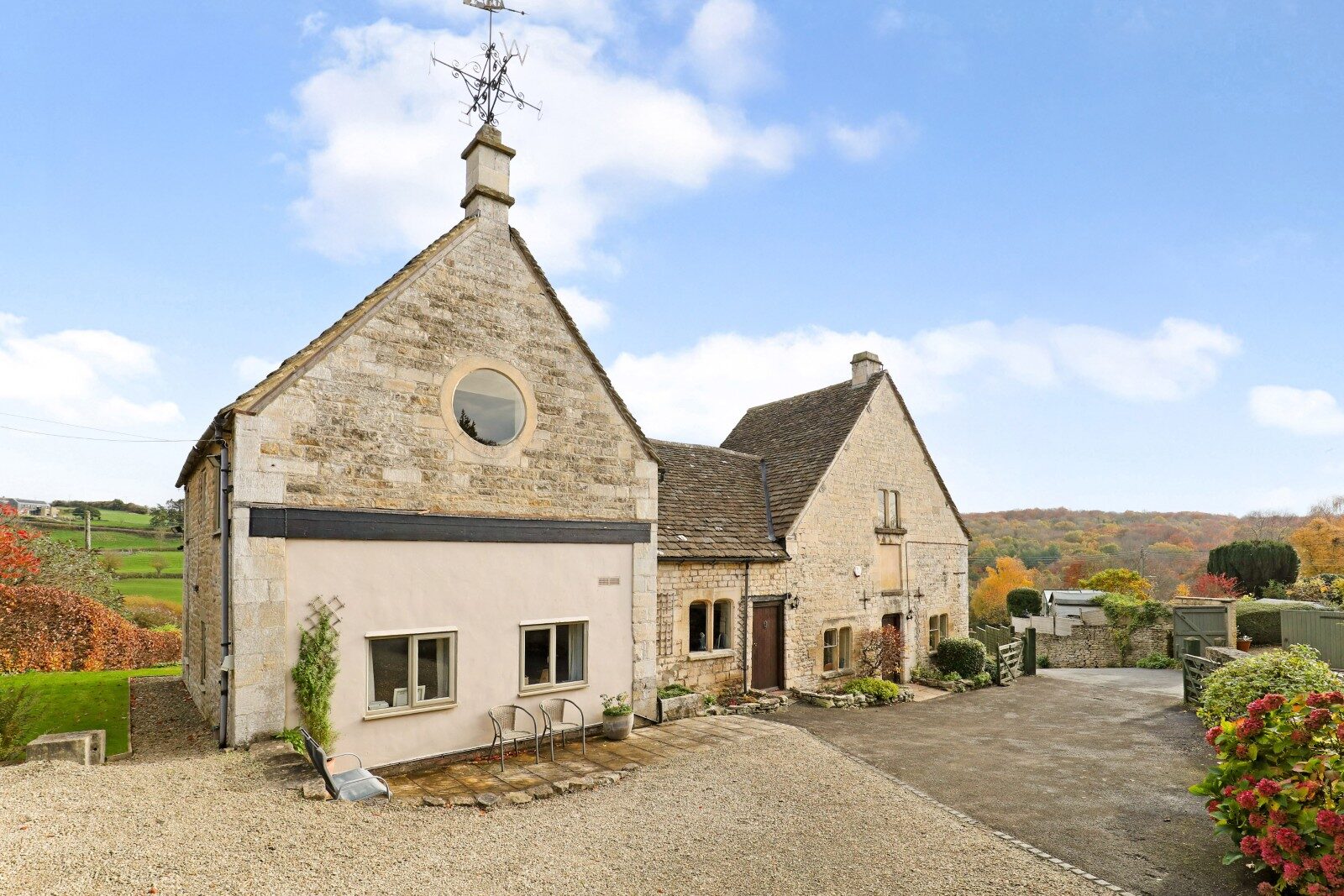 Nestled in a tranquil setting below the historic market town of Minchinhampton and within easy reach of the vibrant market town of Nailsworth, this detached Cotswold stone residence beautifully combines charm, character, and captivating countryside views. Originally serving as the stables and barns to a local country house, the property was sympathetically converted in the 1970s into a delightful home that retains a wealth of character features, including stone mullioned windows, flagstone floors, exposed timbers, high ceilings and wooden floorboards. The accommodation is both flexible and thoughtfully arranged to make the most of the wonderful outlook, with the principal living areas enjoying the views. You enter directly into an impressive and welcoming reception hall, featuring a vaulted ceiling, oak staircase with minstrel’s gallery, and flagstone flooring. This grand entrance offers ample room to create a dining hall — perfect for entertaining. A few steps down from the hall lead to the kitchen/dining/family room. This light and inviting space enjoys a dual aspect with French doors opening onto a patio, ideal for alfresco dining. The fitted kitchen includes built-in appliances and an electric four oven Aga, while there’s plenty of room for a dining table and seating area. A further door leads conveniently to the parking area. At the opposite end of the house, a hallway provides access to two versatile rooms — currently arranged as a bedroom and a home study — along with a shower room in between. A cupboard in this area houses the oil-fired central heating boiler. A beautiful oak staircase rises to the first-floor landing and minstrel’s gallery, leading to the wonderful drawing room. This superb triple-aspect space enjoys a vaulted ceiling, a striking Cotswold stone fireplace, and French doors opening onto a balcony — the perfect spot to relax and take in the glorious semi-rural surroundings. At the far end of the first floor are two further bedrooms, one with views towards the countryside and the other featuring a distinctive round window. A secondary shower room sits conveniently between them.