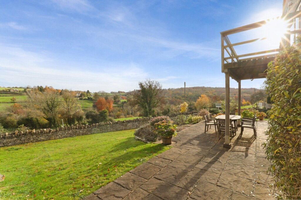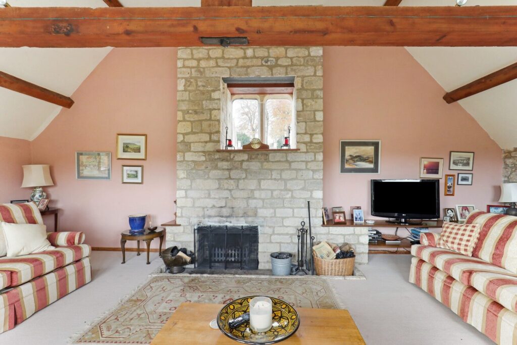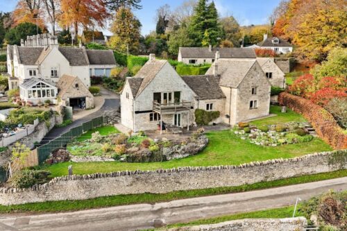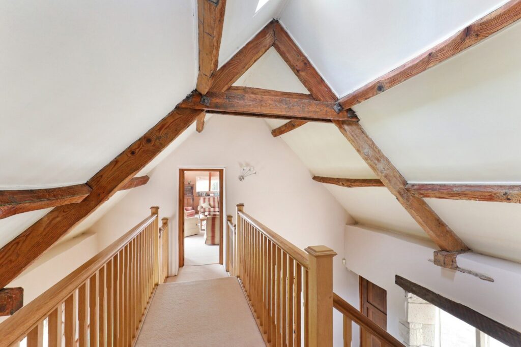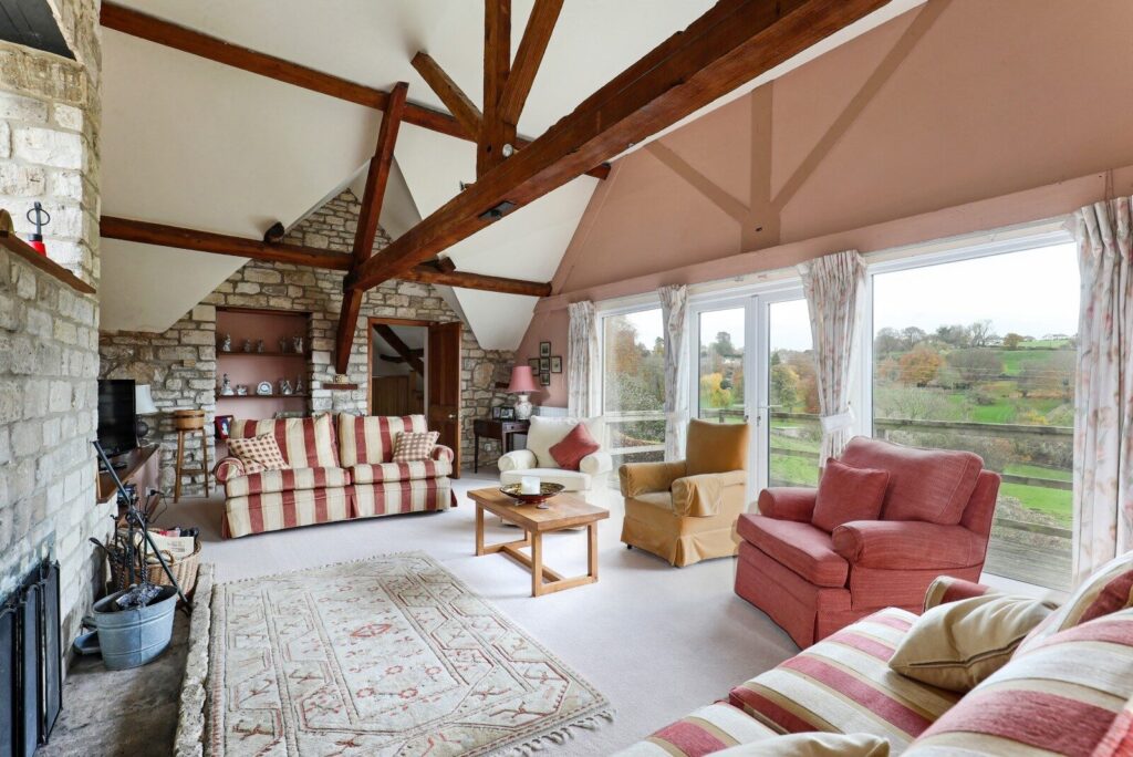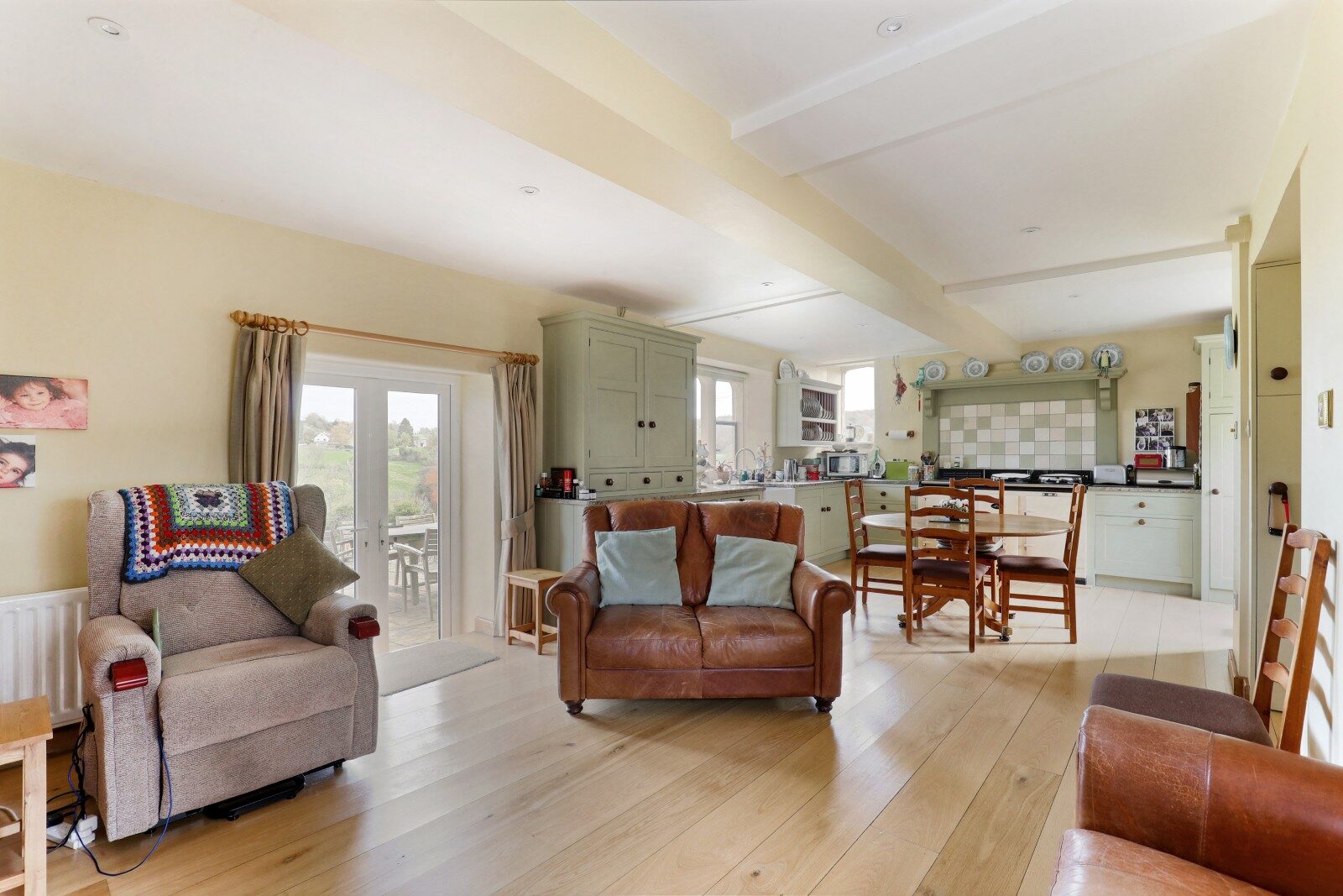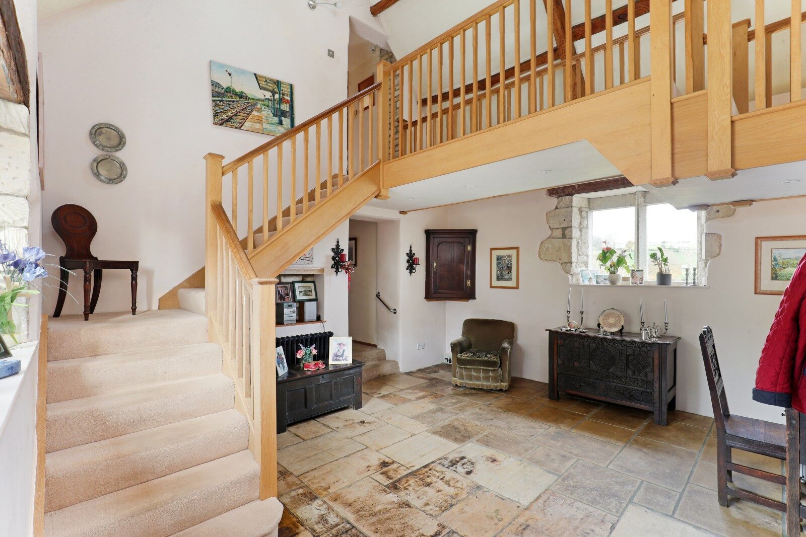Nestled in a tranquil setting below the historic market town of Minchinhampton and within easy reach of the vibrant market town of Nailsworth, this detached Cotswold stone residence beautifully combines charm, character, and captivating countryside views. Originally serving as the stables and barns to a local country house, the property was sympathetically converted in the 1970s into a delightful home that retains a wealth of character features, including stone mullioned windows, flagstone floors, exposed timbers, high ceilings and wooden floorboards. The accommodation is both flexible and thoughtfully arranged to make the most of the wonderful outlook, with the principal living areas enjoying the views. You enter directly into an impressive and welcoming reception hall, featuring a vaulted ceiling, oak staircase with minstrel’s gallery, and flagstone flooring. This grand entrance offers ample room to create a dining hall — perfect for entertaining. A few steps down from the hall lead to the kitchen/dining/family room. This light and inviting space enjoys a dual aspect with French doors opening onto a patio, ideal for alfresco dining. The fitted kitchen includes built-in appliances and an electric four oven Aga, while there’s plenty of room for a dining table and seating area. A further door leads conveniently to the parking area. At the opposite end of the house, a hallway provides access to two versatile rooms — currently arranged as a bedroom and a home study — along with a shower room in between. A cupboard in this area houses the oil-fired central heating boiler. A beautiful oak staircase rises to the first-floor landing and minstrel’s gallery, leading to the wonderful drawing room. This superb triple-aspect space enjoys a vaulted ceiling, a striking Cotswold stone fireplace, and French doors opening onto a balcony — the perfect spot to relax and take in the glorious semi-rural surroundings. At the far end of the first floor are two further bedrooms, one with views towards the countryside and the other featuring a distinctive round window. A secondary shower room sits conveniently between them.